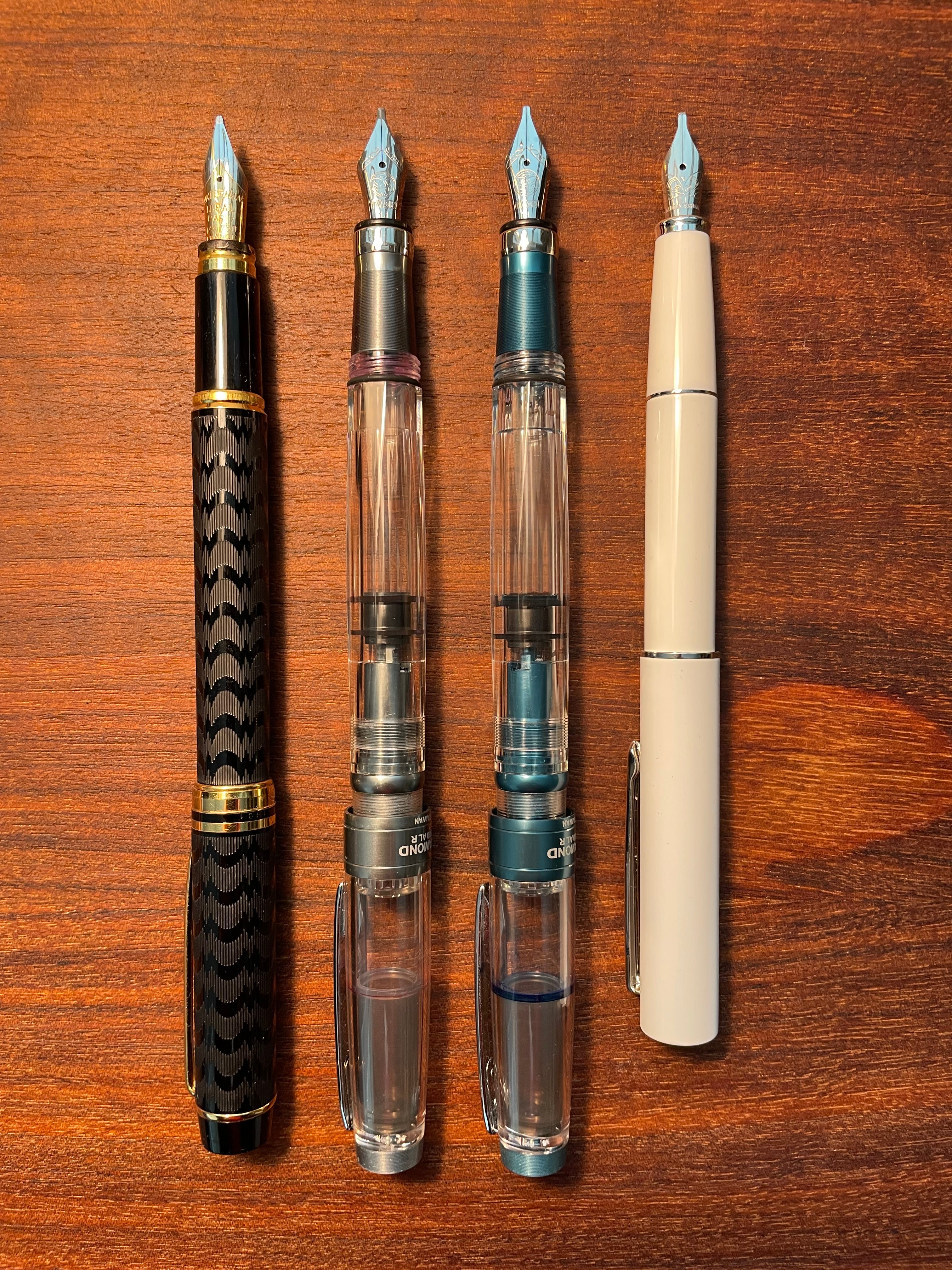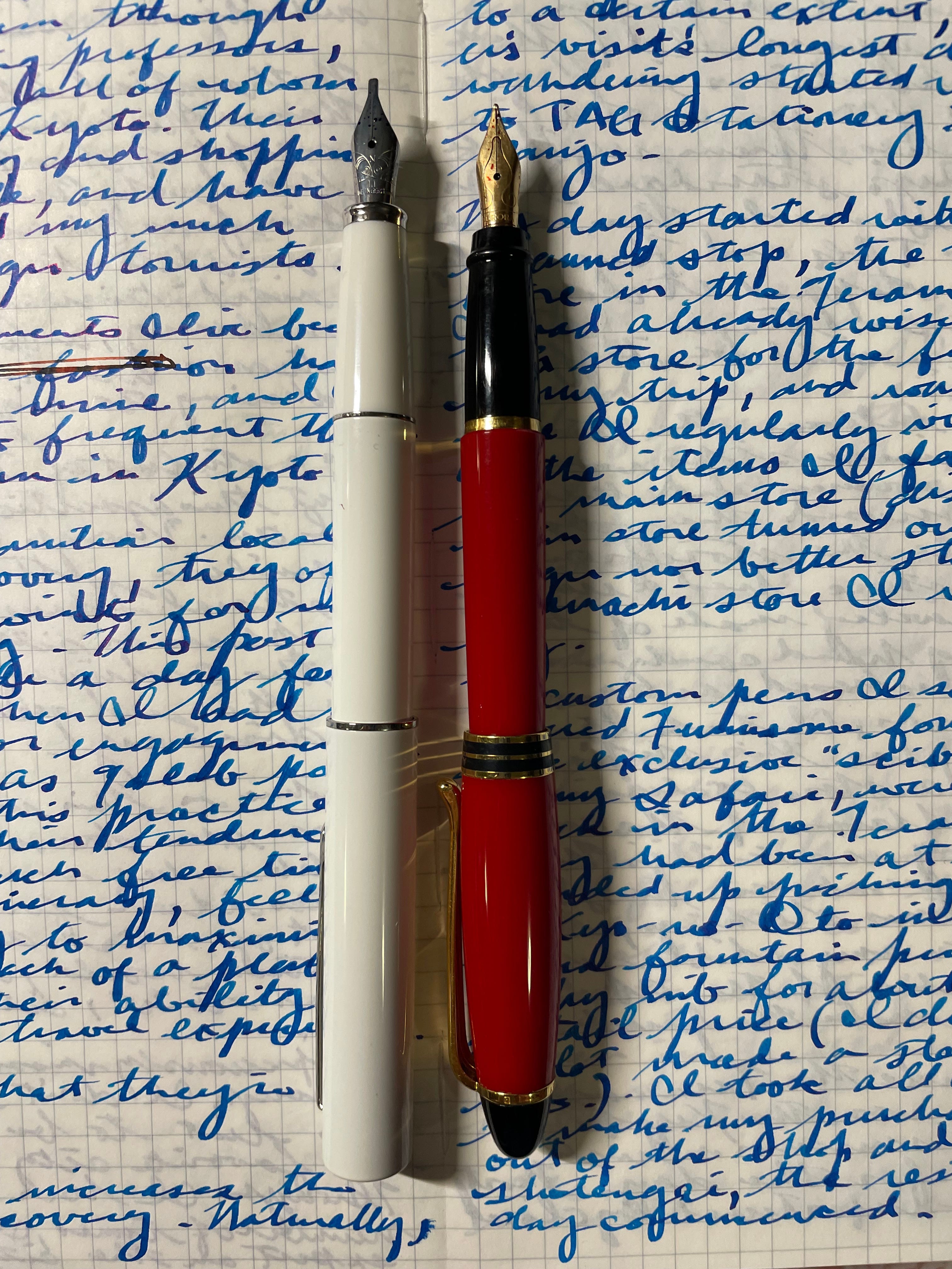 While I do love using all my pens, including those with fine nibs (truth be told, most of the pens in my collection have fine nibs), the best experience writing in cursive by far is with broader nibs. It’s something of a trade-off: fine nib drafts are easier on my eyes when I transcribe, but broad nib drafts are more fun in their creation.